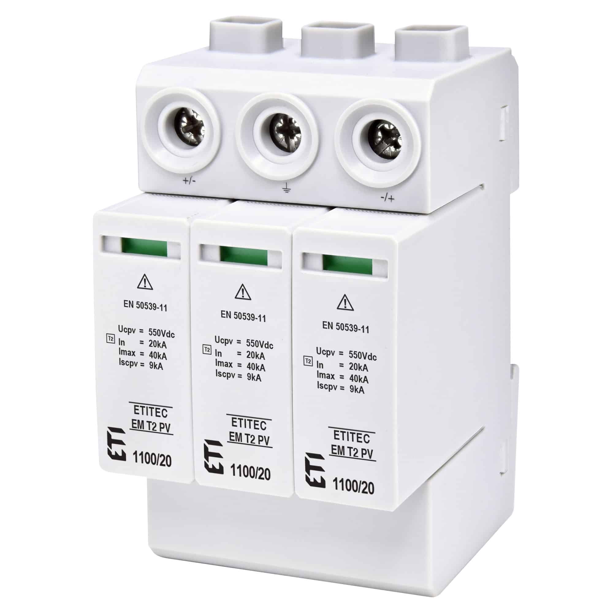 Descărcător de supratensiune ETI ETITEC EM T2 PV 1100/20 Y, conceput special pentru sisteme fotovoltaice (PV). Dispozitivul oferă protecție împotriva supratensiunilor, având o tensiune nominală de 1100 VDC și o configurație de 2+1 poli, tip C. Este debrosabil fără semnalizare, facilitând întreținerea. Produsul se adresează în special echipamentelor de tablou, fiind utilizat în domeniul protecției electrice. Asigură performanță și siguranță în aplicații industriale și comerciale, provenind de la un producător lider în dispozitive de protecție electrică.