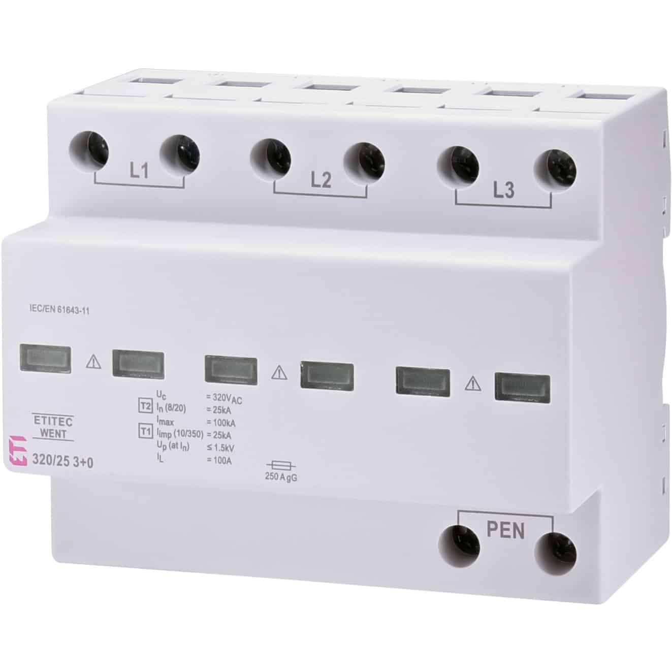 Descărcător de supratensiune ETI, configurație 3+0, tip compact fără semnalizare, 3 poli, tip B+C, tensiune nominală 320VAC, compatibil cu sisteme TN-C. Dispozitiv de protecție împotriva supratensiunilor, proiectat pentru aplicații electrice. Producătorul ETI este un lider mondial în domeniul dispozitivelor de protecție electrică. Acest model oferă protecție eficientă împotriva supratensiunilor tranzitorii în instalațiile electrice.