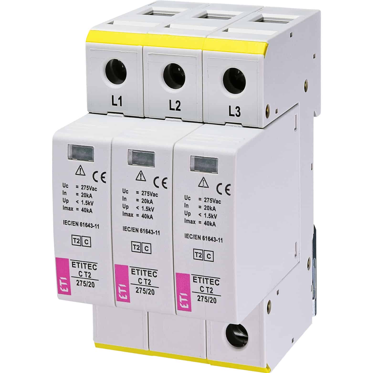 Descărcător la supratensiune ETI, tip 3+0, debrosabil fără semnalizare, 3P, tip C, 275VAC. Acest limitator de supratensiune ETITEC C T2 275/20 (3+0) 3p oferă protecție eficientă împotriva supratensiunilor. Produsul este disponibil cu garanție și certificate de la producător. Specificații tehnice detaliate și scheme sunt incluse pentru o instalare corectă. Dispozitivul este destinat protecției rețelelor electrice împotriva supratensiunilor tranzitorii.