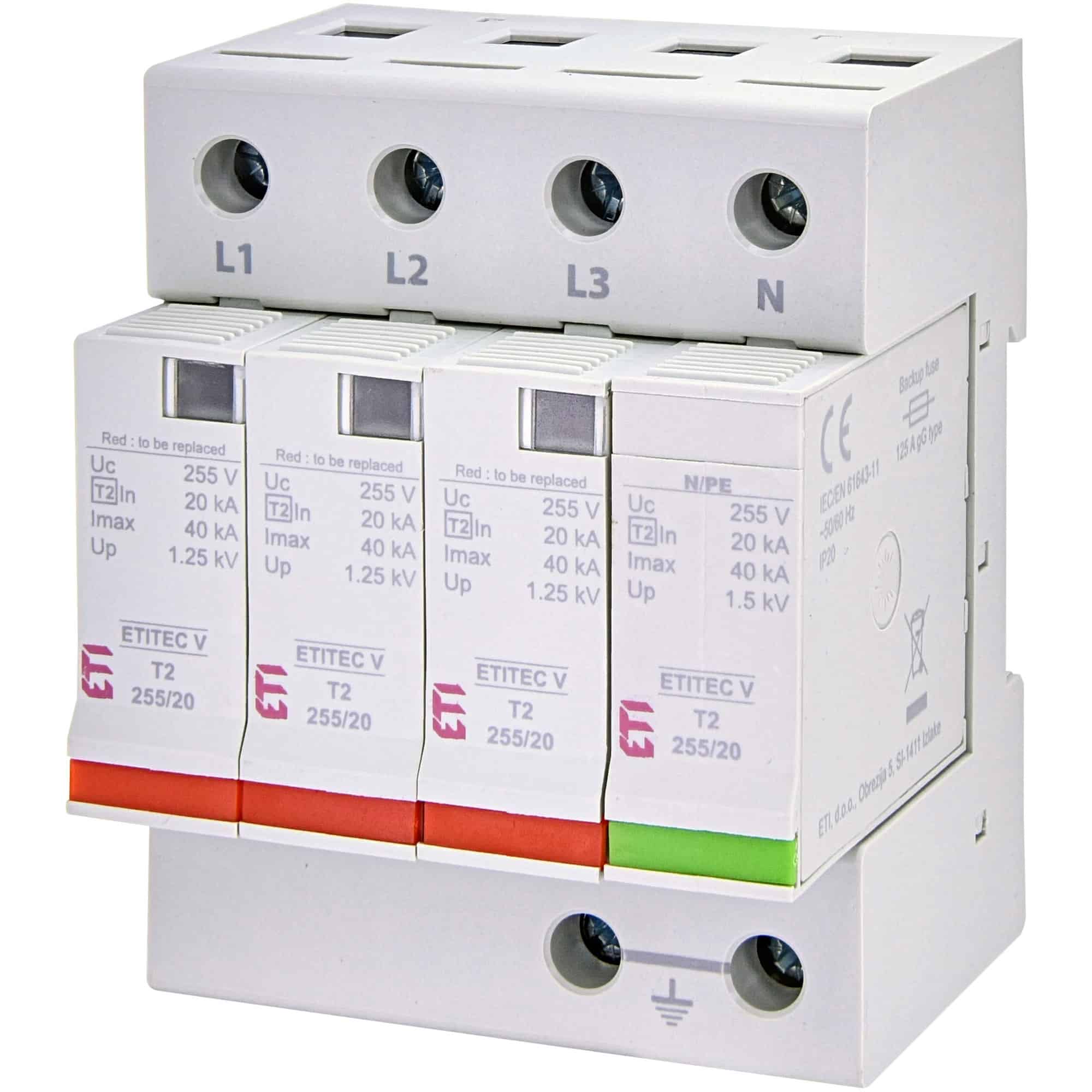 Descărcător de supratensiune ETI ETITEC V T2 255/20, configurație 3+1, tip debrosabil fără semnalizare, 4 poli, tip C, tensiune nominală 255V AC, protecție TT. Dispozitiv de protecție electrică împotriva supratensiunilor, clasificat ca tip 3 (Grup D). Producătorul ETI este un lider mondial în domeniul dispozitivelor de protecție electrică. Acest model oferă protecție eficientă împotriva trăsnetelor și a supratensiunilor tranzitorii din rețelele electrice.