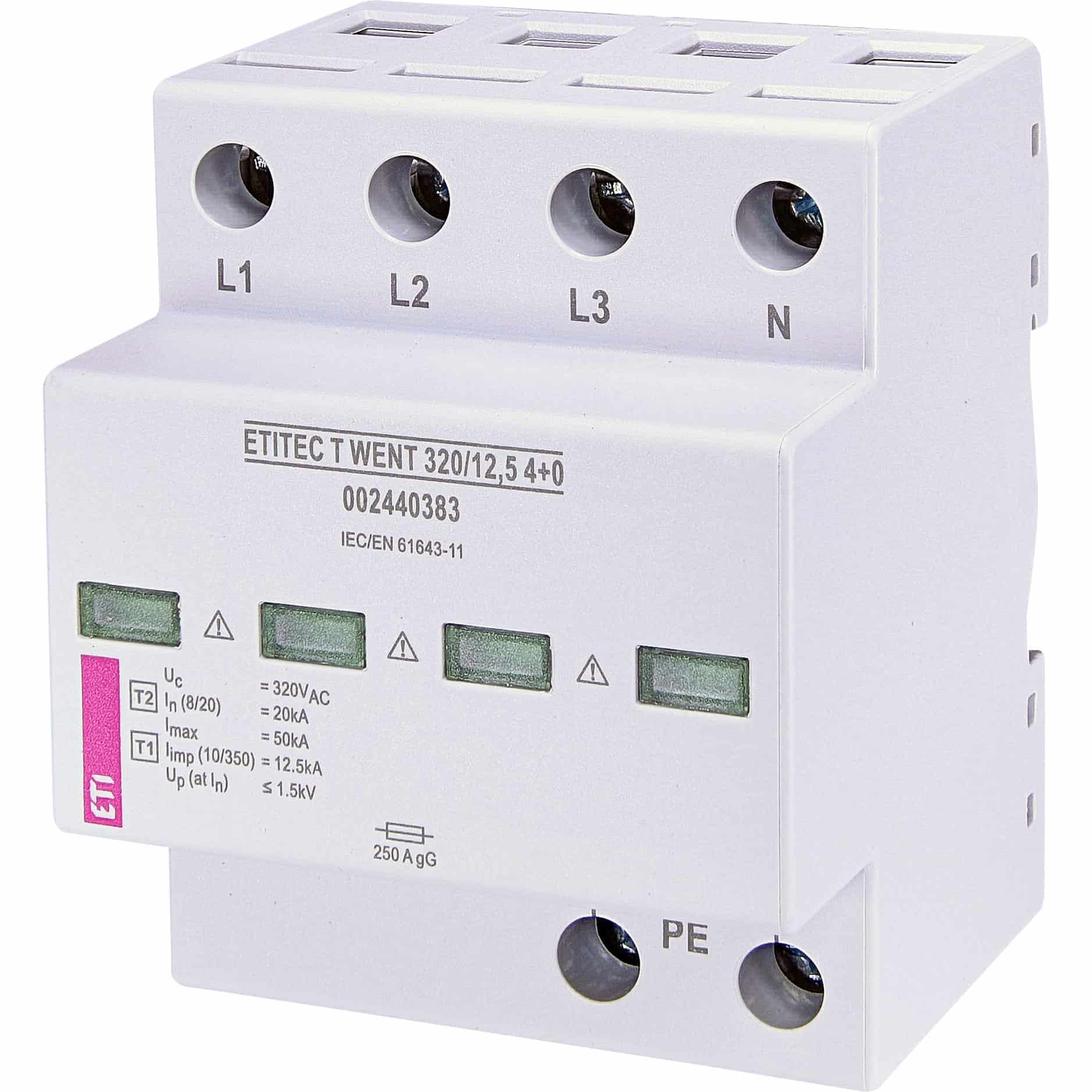 Descărcător la supratensiune ETI, model compact fără semnalizare, configurație 4+0, 4P, tip B+C, pentru tensiune nominală de 320VAC, compatibil cu sistemele TN-S și IT. Dispozitiv de protecție electrică conceput pentru a proteja instalațiile electrice împotriva supratensiunilor tranzitorii. Producătorul ETI este un lider mondial în domeniul dispozitivelor de protecție electrică. Produsul oferă soluții eficiente de protecție împotriva supratensiunilor în aplicații rezidențiale și industriale.