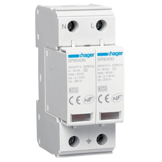 Descărcător la supratensiune Hager pentru sisteme TN-S și TT, cu 2 poli, tip C, 275VAC. Acest dispozitiv de protecție împotriva supratensiunilor (SPD) de tip 2 oferă o capacitate maximă de descărcare de 40 kA. Produsul este destinat atât aplicațiilor rezidențiale, cât și comerciale, integrându-se în sisteme de distribuție a energiei, conexiuni de iluminat și accesorii de cablare. Modulele de protecție SPD asigură securitatea instalațiilor electrice împotriva supratensiunilor tranzitorii.
