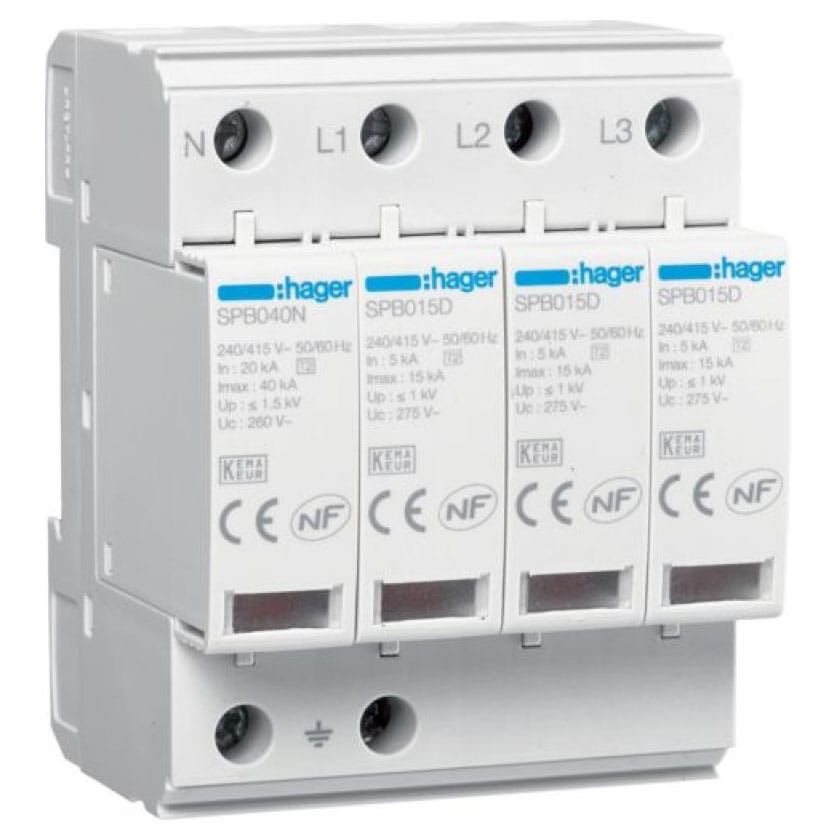Descărcător la supratensiune Hager pentru rețele TN-S și TT, tip 2, cu 4 poli, tensiune nominală 275VAC și curent de descărcare maxim 15 kA. Dispozitivul de protecție SPD asigură protecție eficientă împotriva supratensiunilor tranzitorii în instalațiile electrice. Produsul face parte din gama Hager de dispozitive de protecție la supratensiune, alături de modelele SPB115, SPB213, SPB215, SPB315, SPB413 și SPB415. Acest dispozitiv oferă protecție pentru electronicele de casă și instalațiile electrice rezidențiale și comerciale împotriva supratensiunilor din rețea, fiind ușor de instalat și asigurând liniște sufletească. Este identificat prin codurile 6LE007409Ac și 1227451-02.