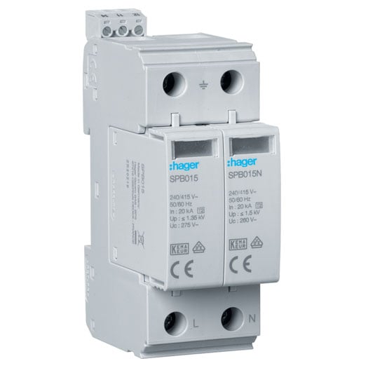 Descărcător de supratensiune Hager tip 2, 2 poli, 40kA, compatibil cu sistemele TT și TN-S. Dotat cu contact de semnalizare defect și indicator vizual de stare. Tensiune nominală de funcționare 275VAC, tensiune de descărcare 1.35kV. Protecție eficientă împotriva supratensiunilor tranzitorii în rețelele electrice. Produsul face parte din gama de protecție împotriva supratensiunilor pentru alimentarea cu energie electrică, fiind potrivit pentru configurații de sistem TN-C-S, TN-S și TT. Cartuș T2 L-N cu caracteristici tehnice superioare pentru o protecție optimă a instalațiilor electrice.