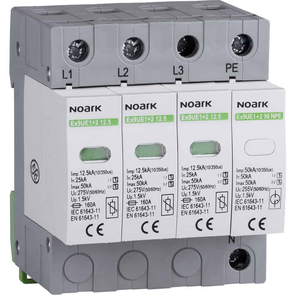 Descărcătorul de supratensiune Noark Ex9UE1+2 12.5 3PN 275 este un dispozitiv de protecție combinat de clasă 1+2 (B+C), conceput pentru protejarea sistemelor electrice împotriva loviturilor directe de intensitate redusă și indirecte de trăsnet. Acest SPD 3P+N oferă protecție conform cerințelor LPL III și IV din standardul EN 62305. Dispozitivul are un curent de descărcare impulsional Iimp de 12,5 kA (10/350 µs) și o tensiune continuă de funcționare Uc de 275 VAC. Este potrivit pentru rețele trifazate standard TN-C și este debrosabil fără semnalizare la distanță. Produsul asigură protecția avansată a echipamentelor electrice împotriva supratensiunilor.