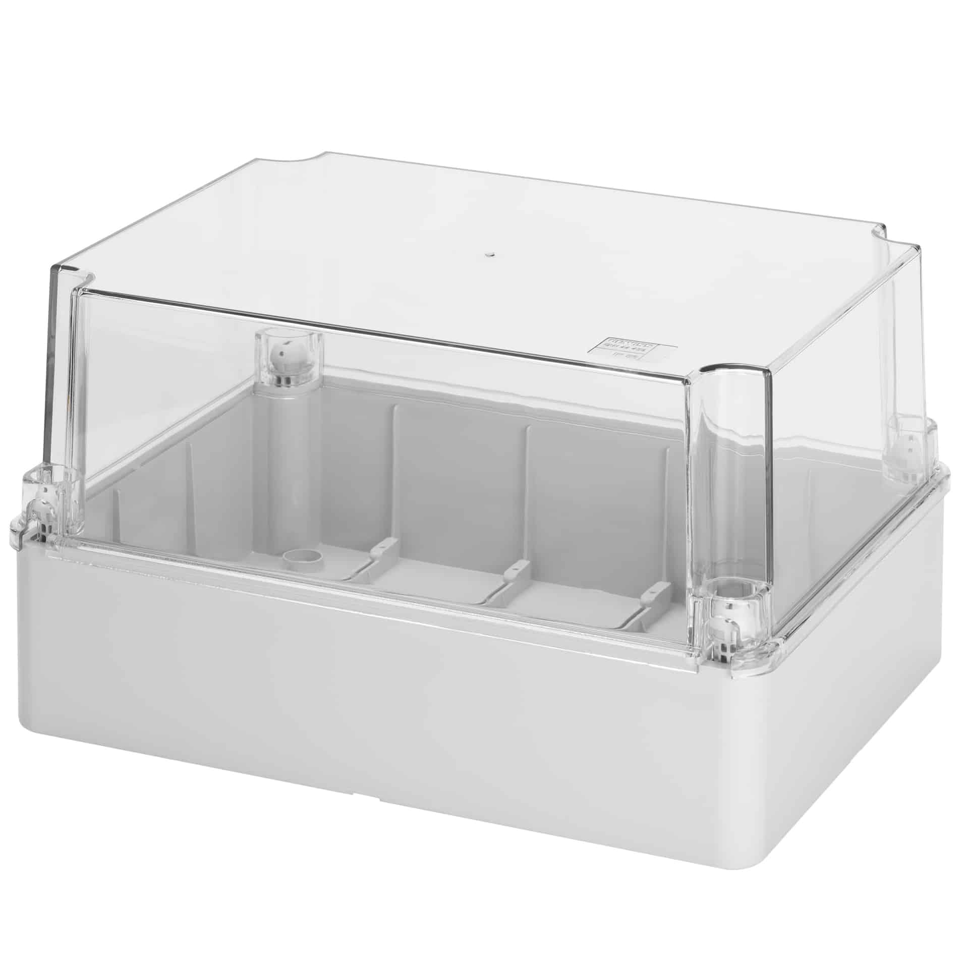 Doza de ramificatie aplicata Gewiss cu capac transparent, dimensiuni interne 380x300x180mm, grad de protectie IP56. Produsul este destinat pentru jonctiuni si pentru echipamente electrice si electronice, cu pereti netezi. Pentru a restaura izolatia dubla si gradul original de protectie IP al cutiilor, se recomanda utilizarea capacelor izolatoare sau a bracketurilor de fixare pentru montaj la suprafata pentru cutii cu dimensiuni de minim 190x140mm. Caracteristici tehnice: tensiune de izolare Ui=1000V in conformitate cu standardele aplicabile. Face parte din gama completa de produse inovative Made in Italy pentru sisteme de conectare, distributie, derivatie si transport de energie.