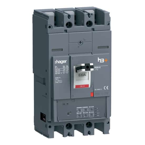 Întreruptor automat MCCB Hager, tip fix, 3 poli, cu capacitate de rupere de 70kA și curent nominal de 630A. Modelul HEW630JR este un dispozitiv de protecție din gama h3+ P630 LSI, proiectat pentru distribuția energiei electrice în aplicații industriale și comerciale. Caracteristici tehnice: curent nominal (Iu) 630A, tensiune nominală 220-690V, tip de conectare – borne cu șuruburi, construcție pentru montaj fix. Acest întreruptor automat oferă protecție LSI (Long-time, Short-time, Instantaneous) și este destinat utilizării în instalații electrice care necesită o capacitate mare de rupere și o performanță sigură în distribuția energiei.