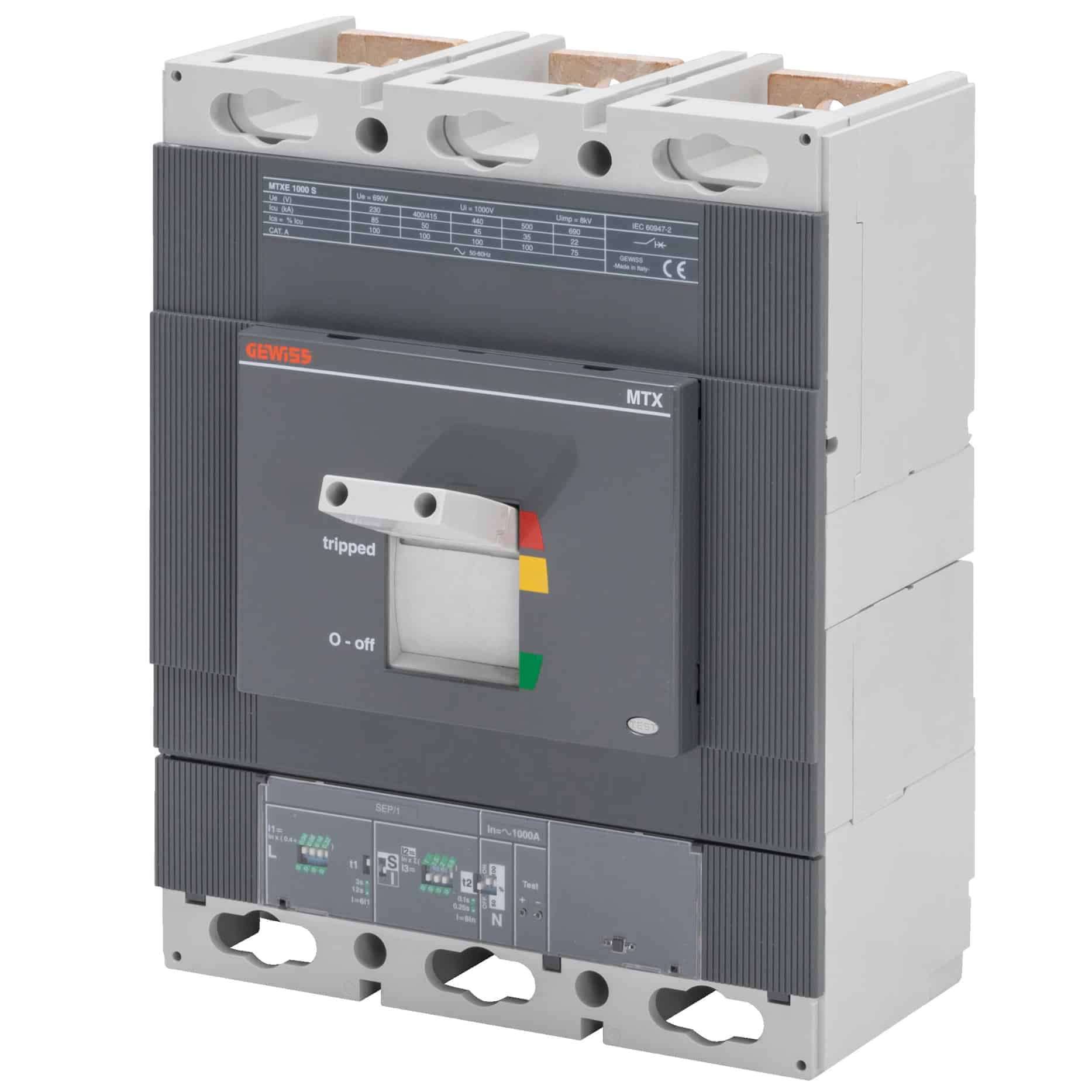 Întreruptor automat MCCB MTXE1000 de la Gewiss, tip LSI, 3P, cu capacitate de rupere de 100kA, electronic, 1000A. Acest întreruptor automat este proiectat pentru protecția circuitelor electrice și asigură o performanță ridicată în aplicații industriale. Cod produs: GWD7861. Brand: Gewiss.