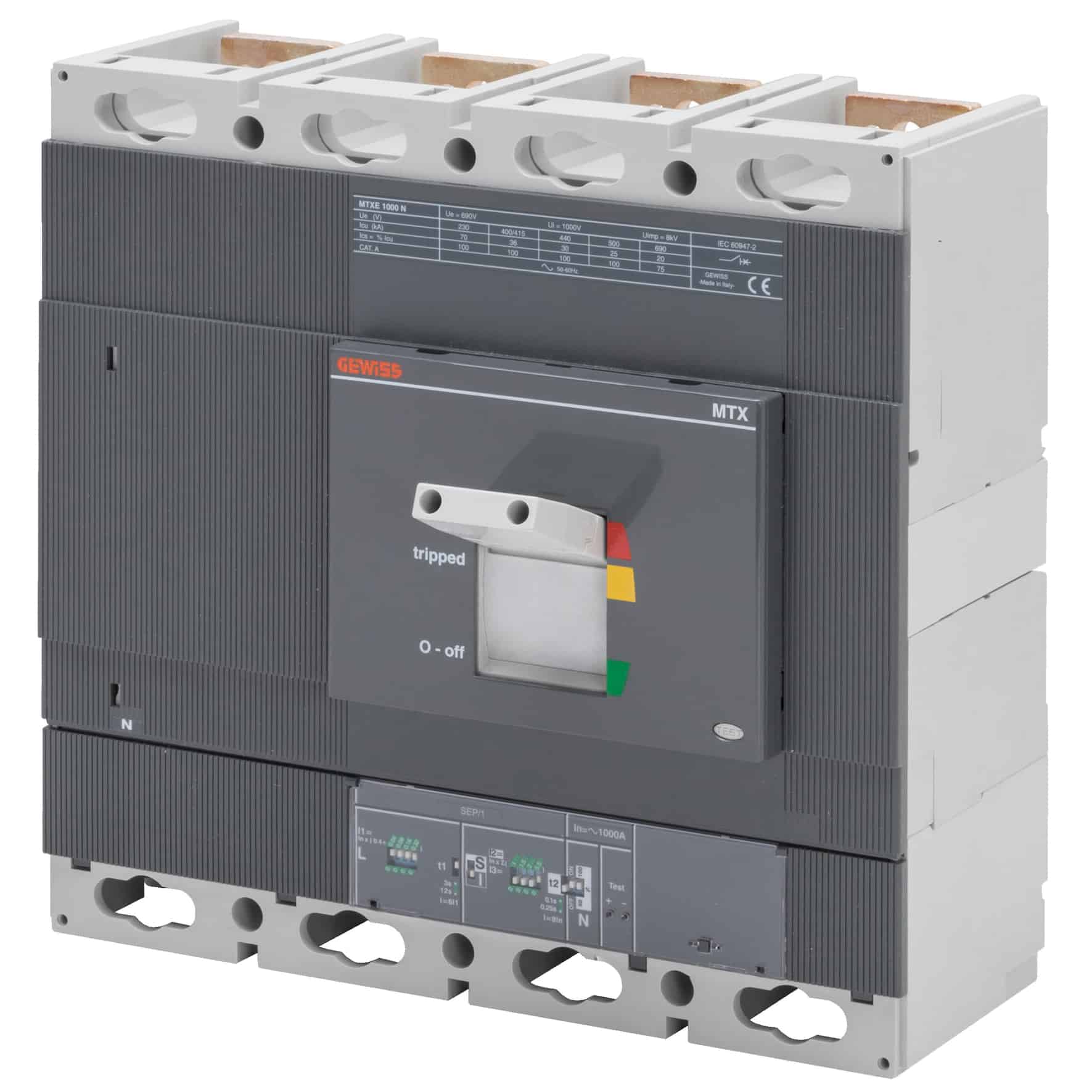 Întreruptor automat MCCB MTXE1000 de la Gewiss, tip LSI, cu 4 poli, capacitate de rupere 50kA, tip electronic și curent nominal 630A. Acest întreruptor automat face parte din gama 90 AM care, pe lângă auxiliarele comune pentru toate întreruptoarele automate, cuprinde multe accesorii modulare pentru protecție, comandă și control. Produsul este identificat prin codul SKU GWD7793 și este conceput pentru aplicații profesionale de distribuție și protecție a circuitelor electrice.