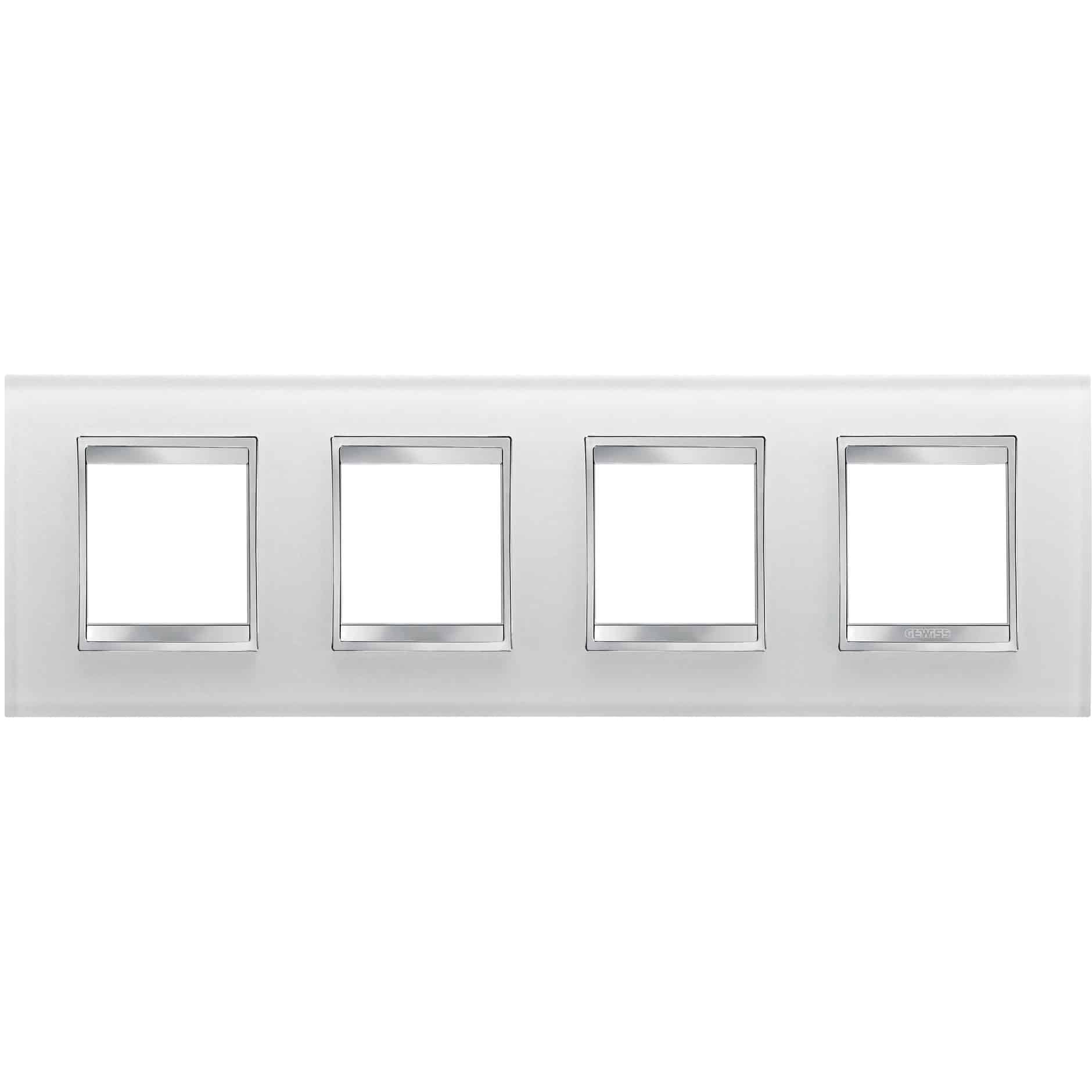 Rama decorativa pentru aparataj unitar Gewiss, configuratie orizontala cu 8 posturi, culoare alb, din gama Chorus Lux International. Acest model GW16228CG este o placă Lux în sticla glasată cu configurație 2+2+2+2 module orizontale. Gama Chorus se remarcă prin linii rafinate și un spirit High-Tech, oferind o gamă de plăci cu forme contemporane care asociază un design modern cu o personalitate puternică. Produsul este destinat utilizării în instalații electrice unitare, oferind o soluție estetică și funcțională pentru spațiile rezidențiale și comerciale.