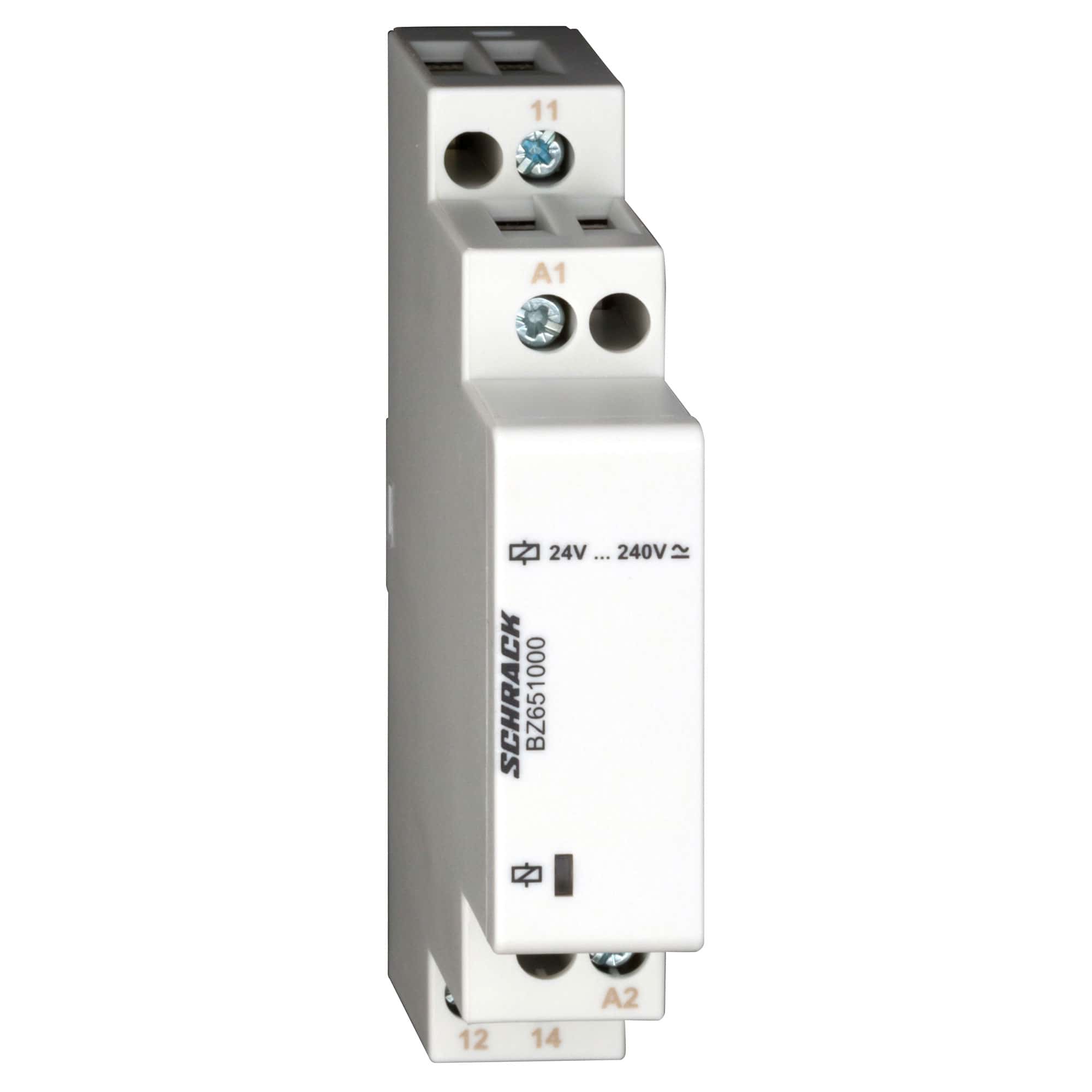 Releu de supraveghere Schrack pentru monitorizarea tensiunii, cu domeniu de operare 24-240V AC/DC. Dotat cu 1 contact deschis (1CO) și capacitate de comutare de 5A. Produsul face parte din categoria hilfsschütze (relee auxiliare) și este proiectat pentru aplicații industriale. Include caracteristici de siguranță și fiabilitate, fiind potrivit pentru utilizare în panouri electrice și sisteme de automatizare. Specificații tehnice: tensiune de operare 24-240V AC/DC, consum de 1,5W/4VA, dimensiune modulară de 17,5mm.