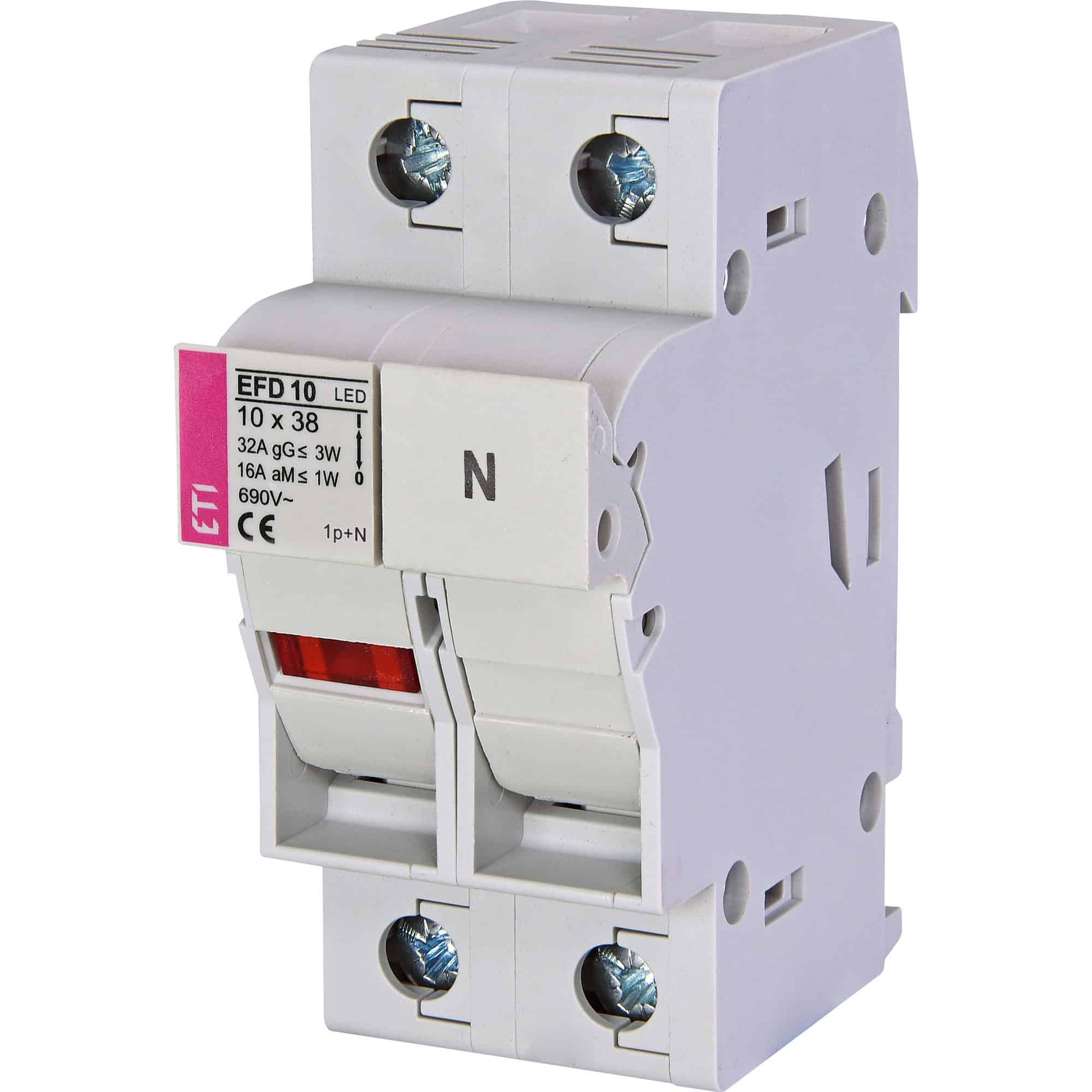Separator tip sertar ETI cu LED, 1P+N, 32A, dimensiuni 10x38mm, tensiune nominală 690VAC/DC. Produsul este un separator modular proiectat pentru aplicații electrice, echipat cu indicator LED pentru semnalizarea stării. Are capacitate de 32A și este compatibil cu sistemele de 690V AC/DC. Separatorul este de tip sertar, facilitând instalarea și întreținerea. Specificațiile tehnice includ dimensiunile compacte de 10x38mm, făcându-l potrivit pentru spații limitate. Produsul este parte a gamei de componente electrice modulare pentru distribuție și control.
