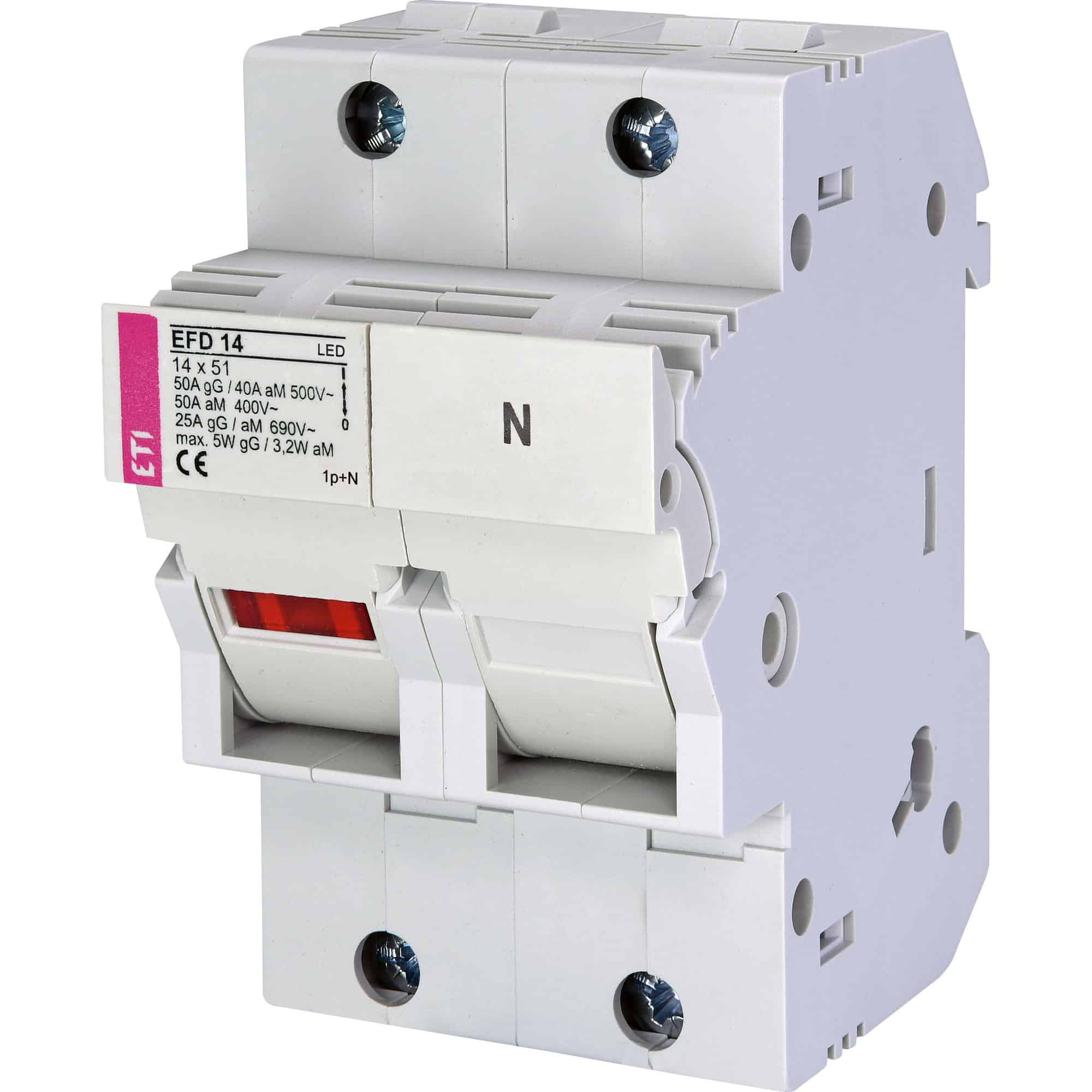 Separator tip sertar ETI cu LED, configurație 1P+N, pentru curent nominal de 50A. Dimensiuni: 14x51mm. Tensiune nominală: 690VAC. Produsul este un separator de tip sertar cu indicator LED, destinat protecției instalațiilor electrice în construcții și instalații industriale. Acest model face parte din gama de produse electrotehnice pentru protecția circuitelor electrice.