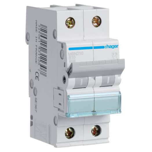 Disjunctor automat bipolar Hager MBN210 este un întrerupător de circuit în miniatură cu 2 poli, caracteristică de declanșare B și curent nominal de 10A. Acest disjunctor are o capacitate de rupere de 6kA și este proiectat pentru o tensiune nominală de 400V, cu tensiunea nominală de izolație Ui de 500V. Produsul are 2 poli totali, ambii fiind poli fuzibili, oferind protecție eficientă împotriva suprasarcinilor și scurtcircuitelor. Disjunctorul Hager MBN210 face parte din gama de produse de distribuție a energiei, fiind potrivit atât pentru aplicații rezidențiale, cât și comerciale.