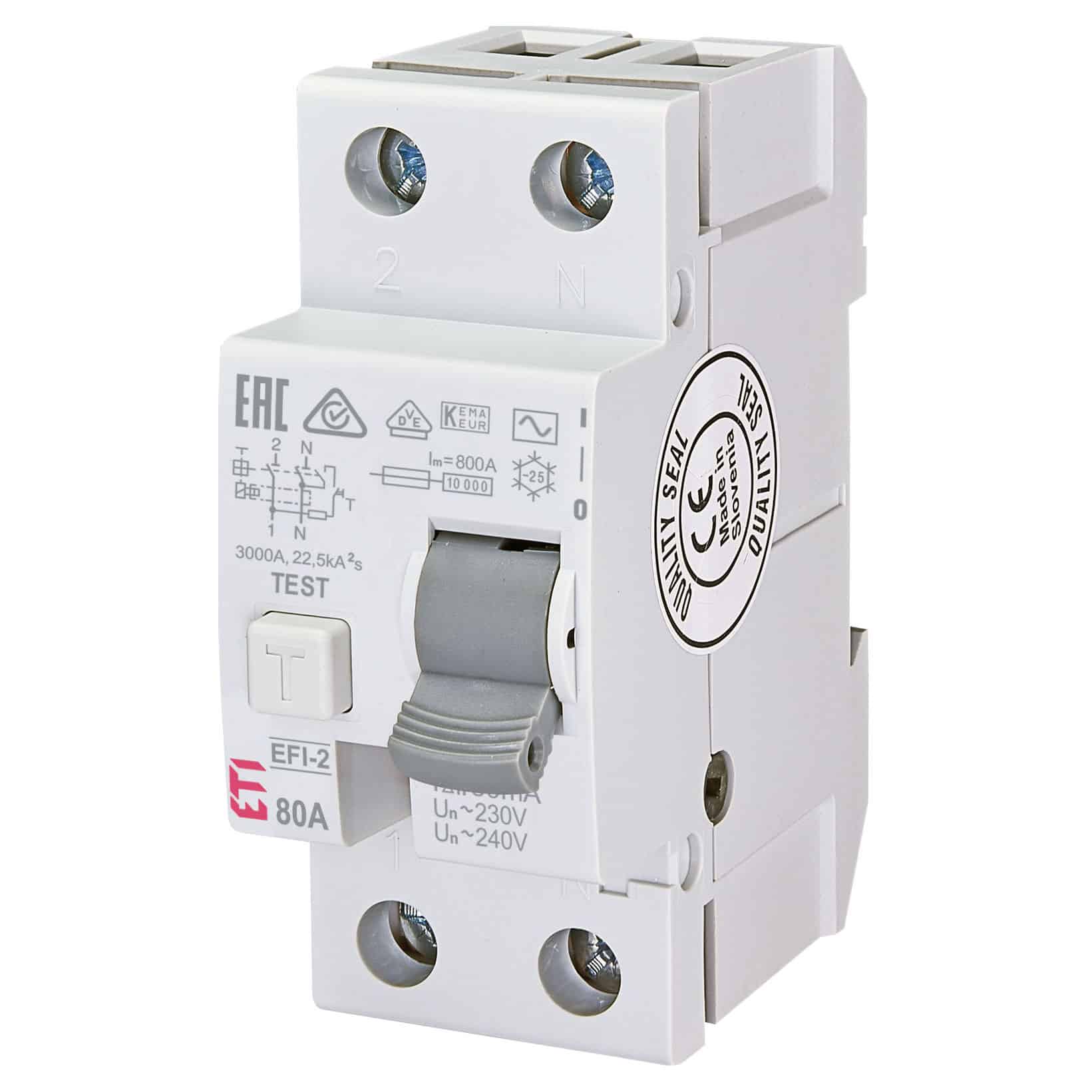 Siguranță automată (disjunctor) cu protecție diferențială monofazică ETI, 80A, 30mA, RCCB, tip AC, 10kA, EFI-2. Acest disjunctor diferențial oferă protecție împotriva scurtcircuitelor și a curenților de defect la pământ, fiind proiectat pentru aplicații rezidențiale și industriale. Cu un curent nominal de 80A și sensibilitate de 30mA, asigură o deconectare rapidă în cazul unor defecțiuni electrice. Produsul este de tip AC, potrivit pentru curent alternativ, cu capacitate de rupere de 10kA. Modelul EFI-2 oferă performanțe ridicate și fiabilitate în funcționare.