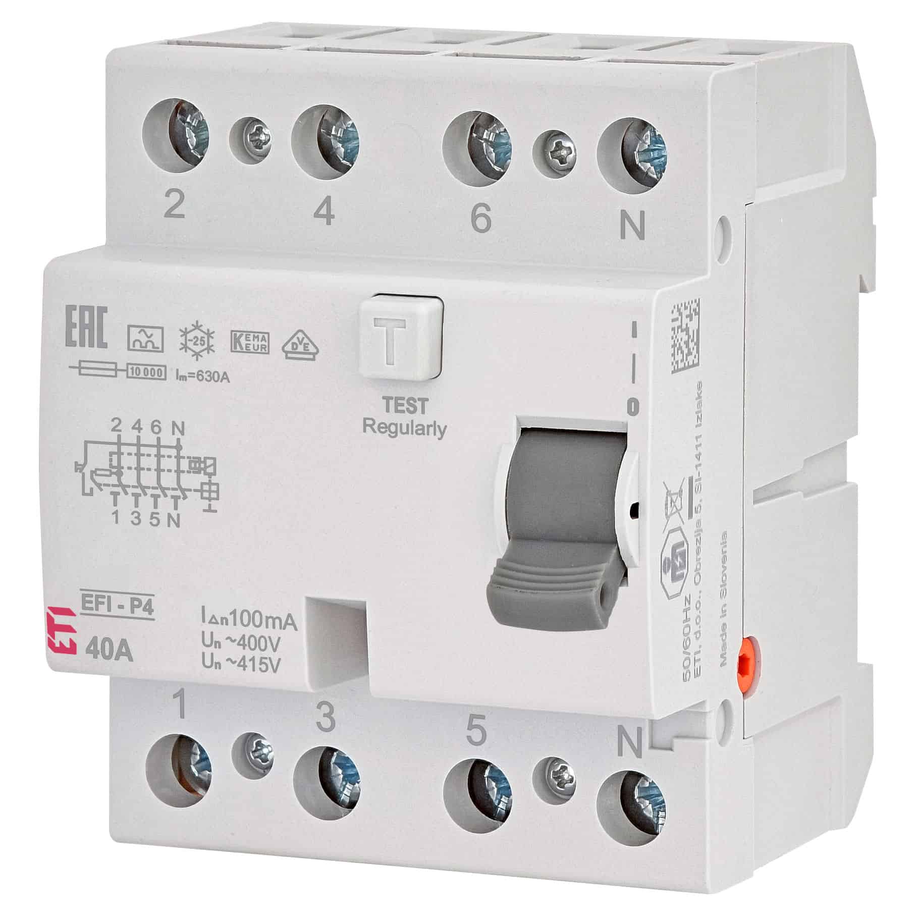 Siguranța automată (disjunctor) cu protecție diferențială trifazică ETI, 40A, 100mA, RCCB, tip A, 10kA, EFI. Acest disjunctor diferențial oferă protecție împotriva curenților de scurgere și este proiectat pentru aplicații trifazice. Produsul face parte din gama de siguranțe automate cu protecție diferențială și este identificat prin codul 002061522. Dispozitivul asigură protecție la un curent nominal de 40A cu sensibilitate de 100mA și este de tip A, potrivit pentru detectarea curenților alternativi și pulsatili. Capabil să suporte un curent de scurtcircuit de până la 10kA, acest model EFI oferă siguranță și fiabilitate în instalatiile electrice. Este un dispozitiv de protecție diferențială (RCD) care asigură deconectarea circuitului în cazul detectării unui dezechilibru de curent.