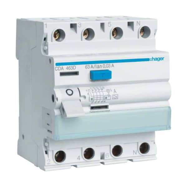 Siguranță automată (disjunctor) cu protecție diferențială trifazică Hager, 80A, 30mA, RCCB, tip A, 10kA. Acest disjunctor diferențial 4P oferă protecție împotriva curenților de scurgere și este clasificat tip A, fiind potrivit pentru distribuția energiei electrice în instalații trifazate. Dispozitivul asigură o protecție eficientă la 30mA și suportă un curent nominal de 80A, cu o capacitate de rupere de 10kA. Face parte din gama de modulkészülékek (dispozitive modulare) Hager CD, proiectat pentru aplicații rezidențiale și comerciale care necesită protecție diferențială de înaltă calitate.