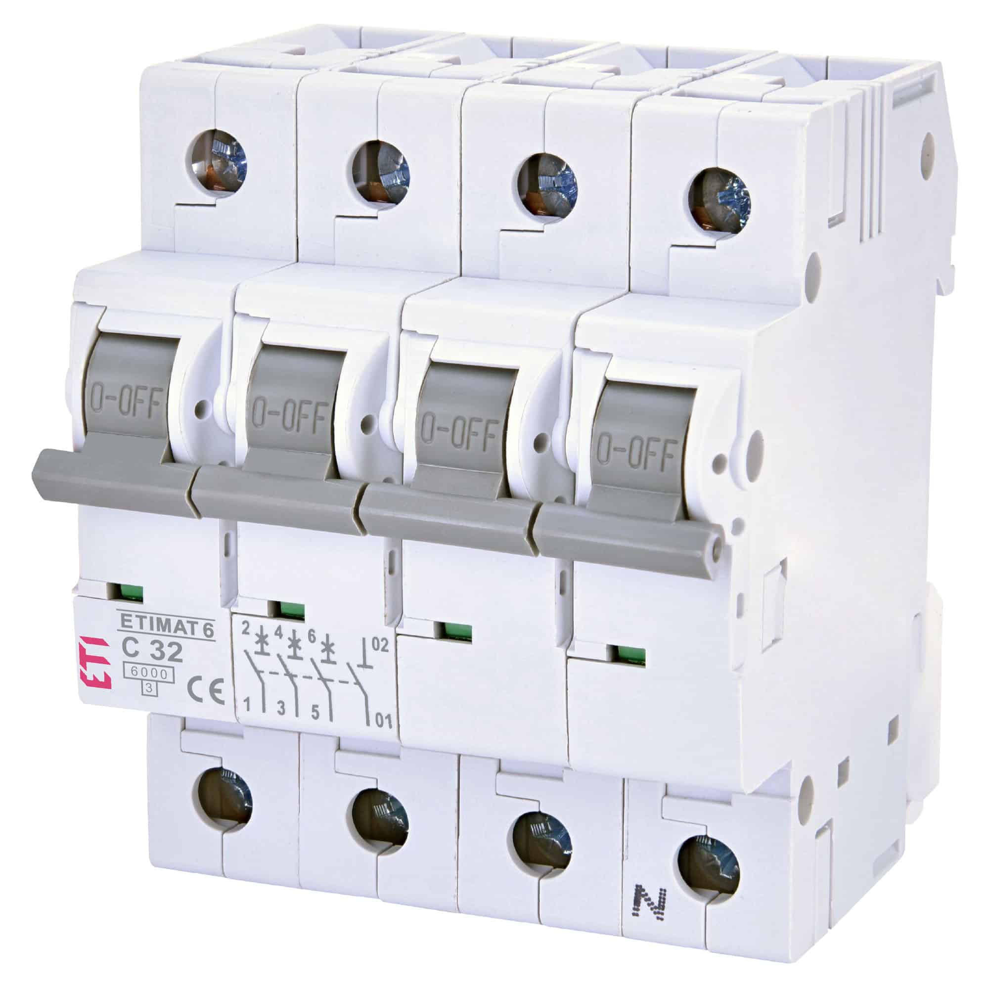 Siguranta automata (disjunctor) tetrapolara ETI, model ETIMAT 6, cu configurație 3P+N, curent nominal de 32A, caracteristică de declanșare curba C și putere de rupere de 6kA. Acest disjunctor oferă protecție electrică fiabilă pentru instalații, fiind produs de ETI, un producător lider mondial de dispozitive de protecție electrică. Dispozitivul este proiectat pentru a asigura siguranța circuitelor electrice prin declanșare automată în caz de suprasarcina sau scurtcircuit, conform caracteristicii de funcționare curba C.