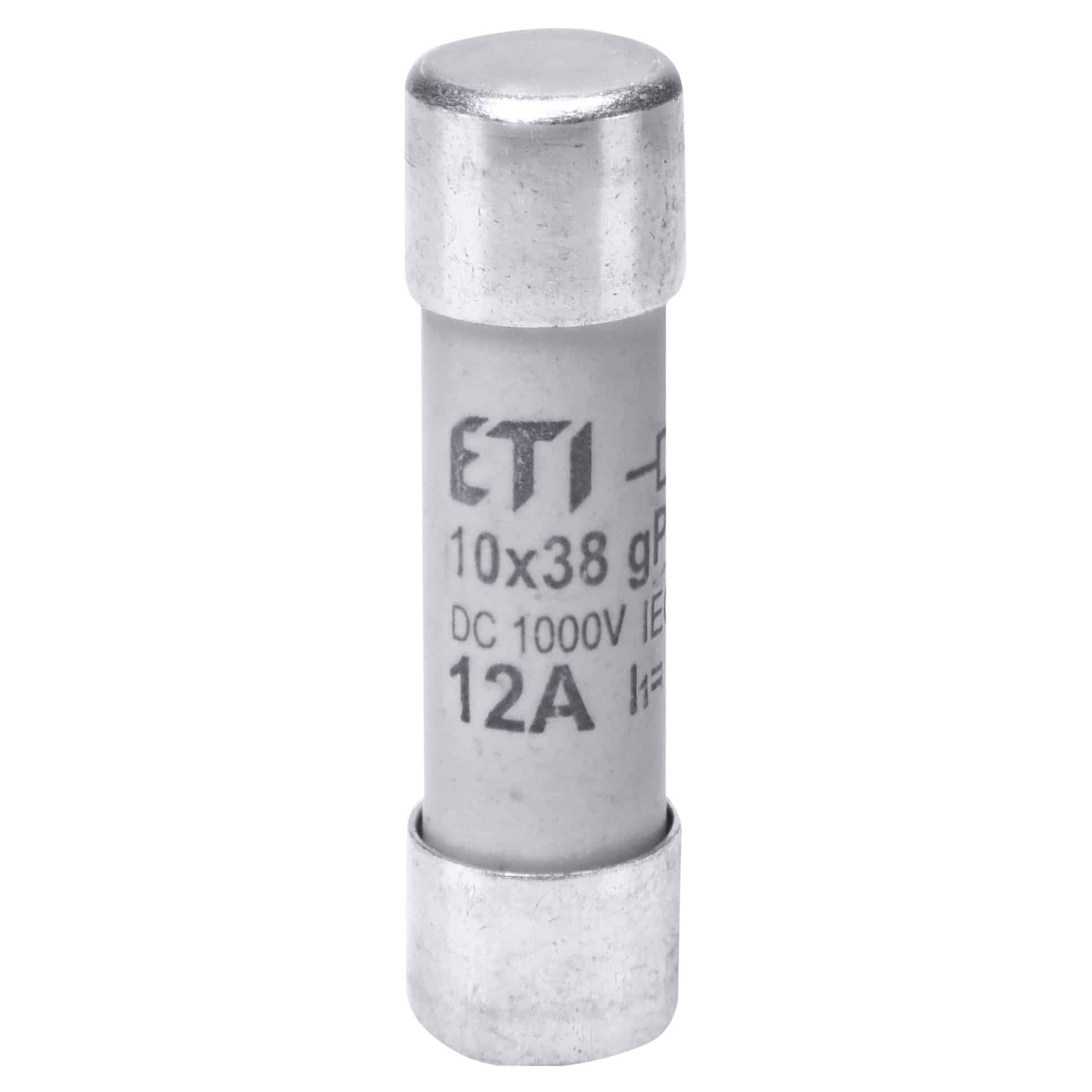 Siguranță fuzibilă cilindrică ETI pentru sisteme fotovoltaice, cu dimensiuni 10x38mm, tip gPV, nominală 12A și tensiune de lucru 1000VDC. Produsul oferă o capacitate de rupere de 10kA și este proiectat special pentru protecția modulelor fotovoltaice. Acest dispozitiv de protecție este conform cu standardul UL și este fabricat de ETI, un producător lider mondial de dispozitive de protecție electrică. Siguranța este potrivită pentru utilizare în instalații fotovoltaice, asigurând protecție împotriva suprasarcinilor și scurtcircuitelor în sistemele de energie solară.