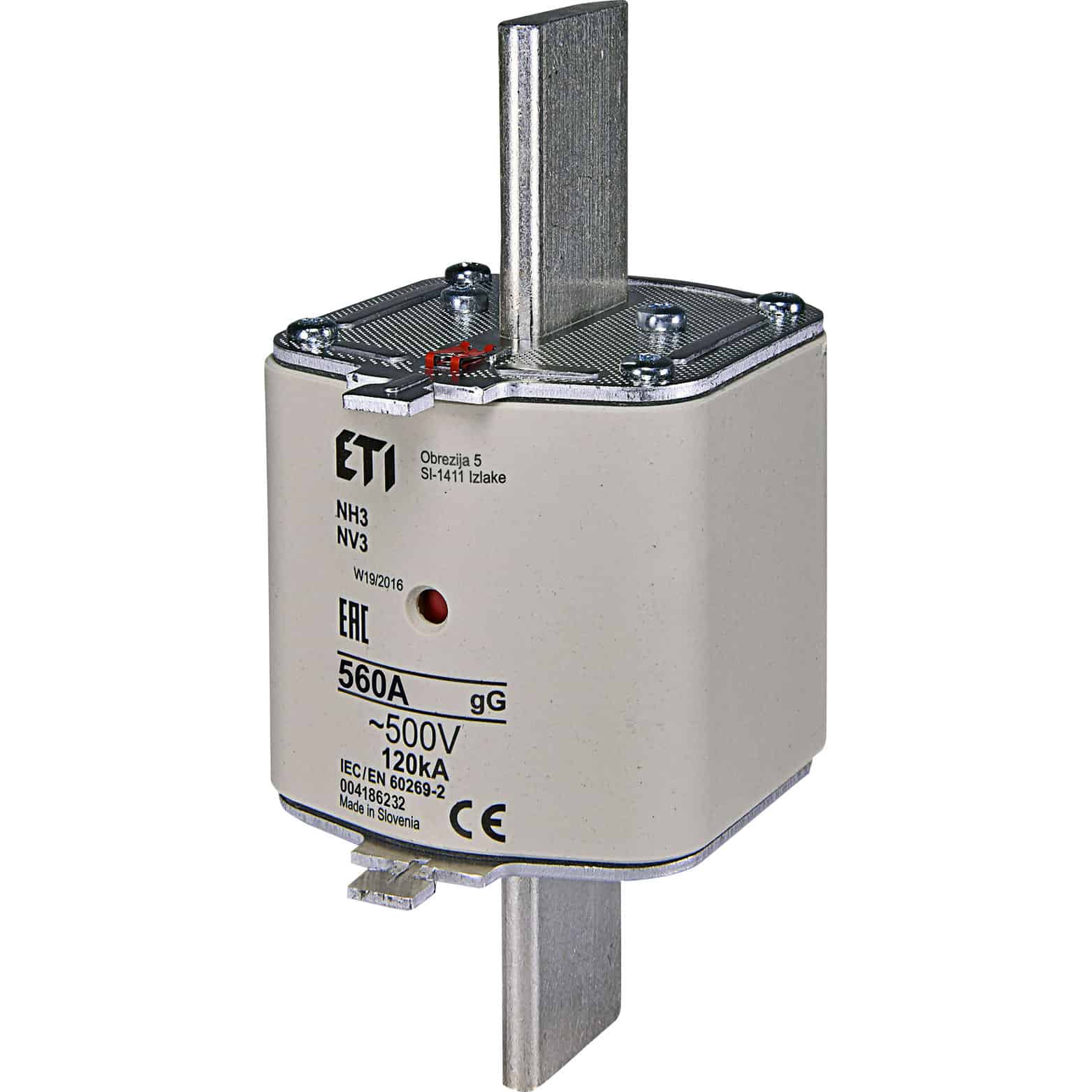 Siguranță fuzibilă MPR fără izolație ETI, din grupa 3, cu caracteristica gG. Este proiectată pentru un curent nominal de 560A și o tensiune de 500VAC, având o capacitate de rupere de 120kA. Acest tip de siguranță, cu prindere fără șurub (denumirea tehnică gL-gG), este potrivită pentru aplicații industriale. Produsul este identificat prin codul 004186232.