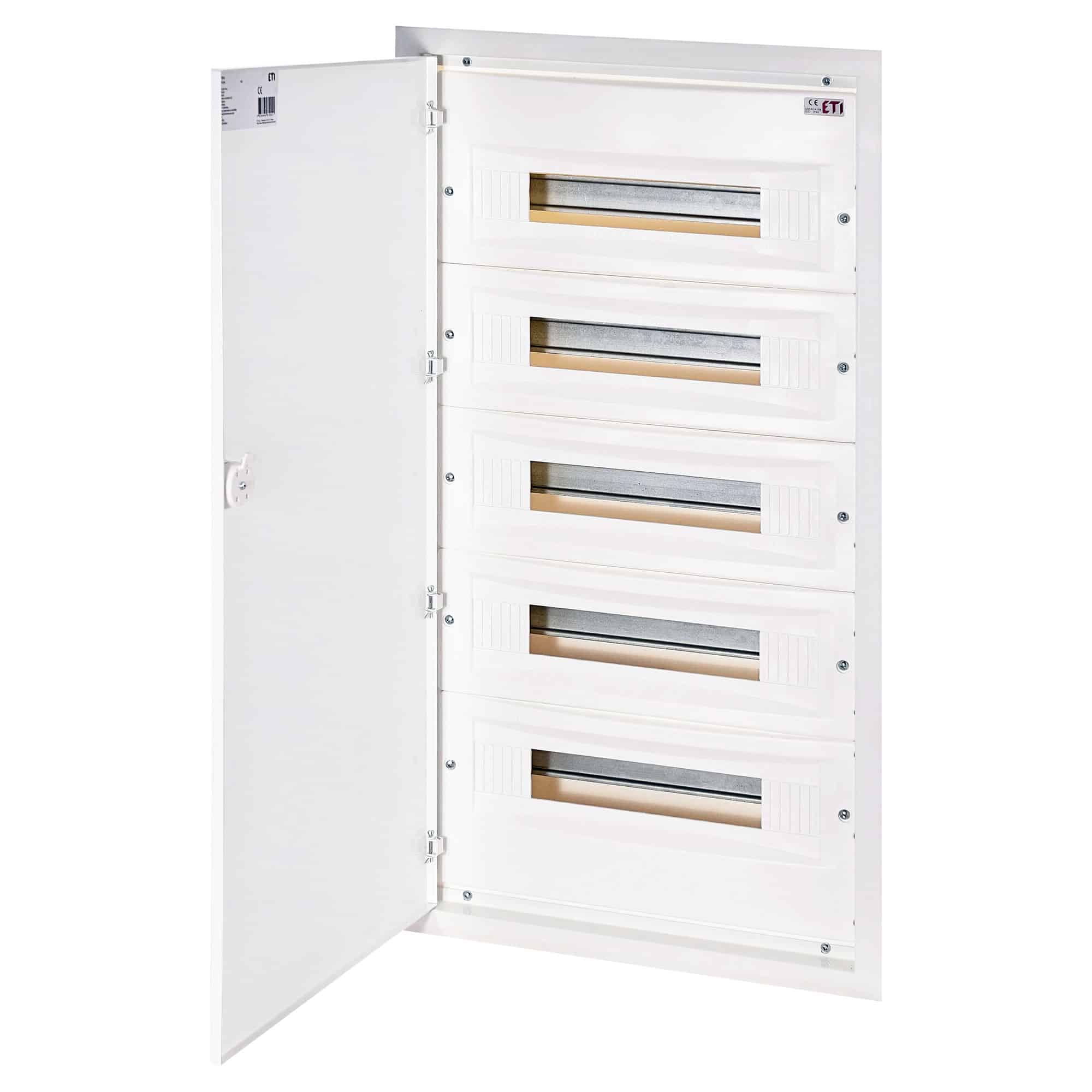 Tablou electric metalic ETI cu 90 de module, tip incastrat, dimensiune 5X18, echipat cu plastroane. Produsul are gradul de protectie IP40 si este destinat utilizarii in instalatii electrice. Acest tablou de distributie este fabricat din metal si plastica, oferind protectie si organizare modulelor electrice. Disponibil pentru procurare cu garantie si certificare de la producator, cu optiuni de livrare in toata tara si posibilitate de ridicare din depozit.