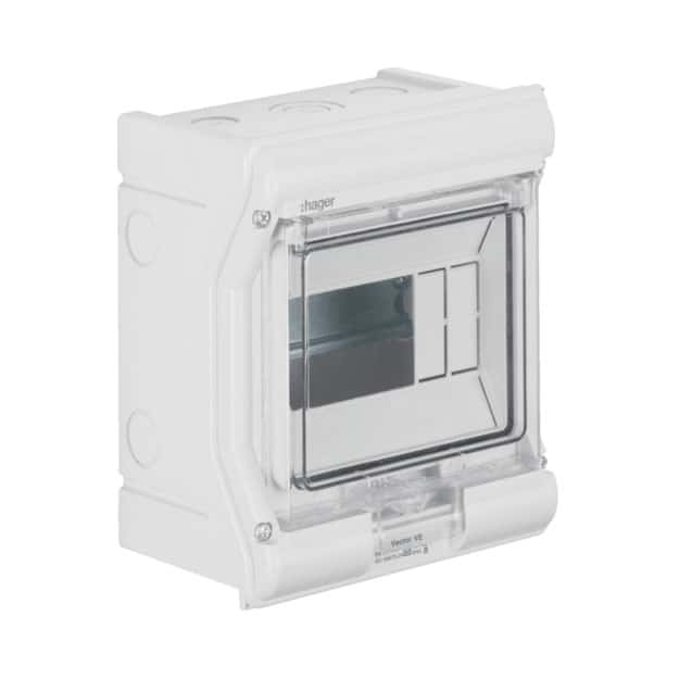 Tablou electric Hager Vector VE106PN este un distribuitor de suprafață montat pe perete, cu 6 module și o lățime de 190mm. Construit din PVC stabil la UV, oferă protecție IP54/IP65, fiind potrivit pentru aplicații fotovoltaice. Distribuitorul are o singură rând, ușă închisă cu versiune ușoară și capacitate transparentă pentru transmiterea semnalelor. Include șină portabilă cu terminal PE/N. Este un distribuitor mic de instalare, proiectat pentru montaj pe suprafață în condiții de mediu exigente.